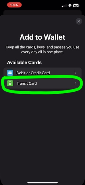 - Busca y selecciona la tarjeta Suica o Icoca de la lista de tarjetas de transporte disponibles.
